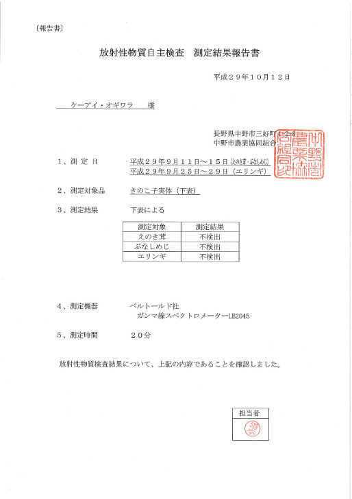 放射性物質検査 放射性物質自主検査 原発事故以降、セシウムなどの放射性物質の残留問題などもあり、放射能の影響が長期間に及んでいることから、取引先や消費者の皆様の不安は解消していないのが現状です。皆様に安心してきのこを食べていただけるように、第三者であるJA中野市による放射性物質自主検査を定期的に実施しています。